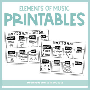 - 4 Versions of Printables including 5, 6, 7 and 8 Elements of Music each with multiple copies that have various musical terminology.