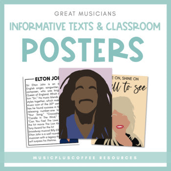 These posters are the perfect addition to your classroom decor! I love both sets of posters for a bulletin board or for above your main board in your room (like an alphabet line.) The short bios for each musician are geared more towards your junior students and focus on the positive aspects of the musicians lives. There are four printables included as well in case you want to turn these posters and bios into a fun activity to do withyour students! These pages are not editable. If you have any further questions or concerns, please email me at gina@musicpluscoffee.com