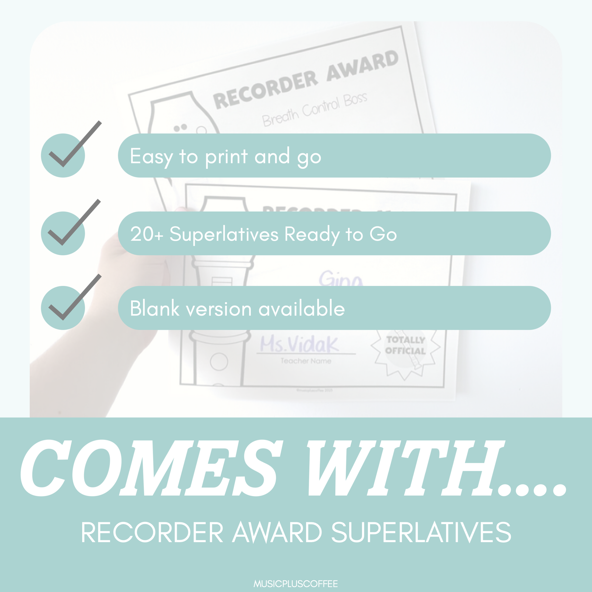 Celebrate your recorder rockstars with this engaging set of 20+ recorder-themed superlative awards! Perfect for wrapping up a recorder unit, these printable awards highlight each student’s unique strengths and personalities—both musical and silly! This resource adds joy, laughter, and a sense of accomplishment to your music classroom.